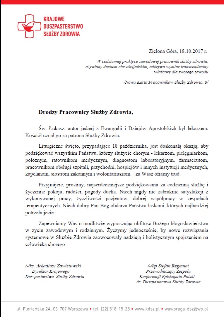 Życzenia i podziękowania od Krajowego Duszpasterstwa Służby Zdrowia