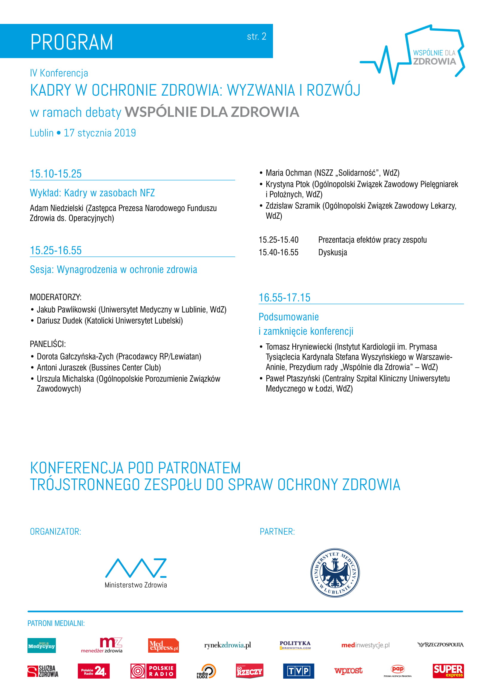17 stycznia 2019 r. w Lublinie odbędzie się czwarta konferencja w ramach Ogólnopolskiej Debaty „Wspólnie dla Zdrowia”, pt. „Kadry w ochronie zdrowia: wyzwania i rozwój”.