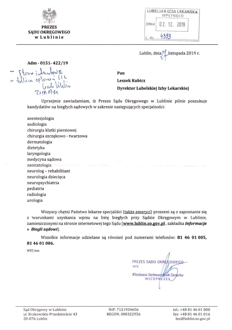 INFORMACJE OGÓLNE dla kandydatów na biegłych na stronie SO w Lublinie