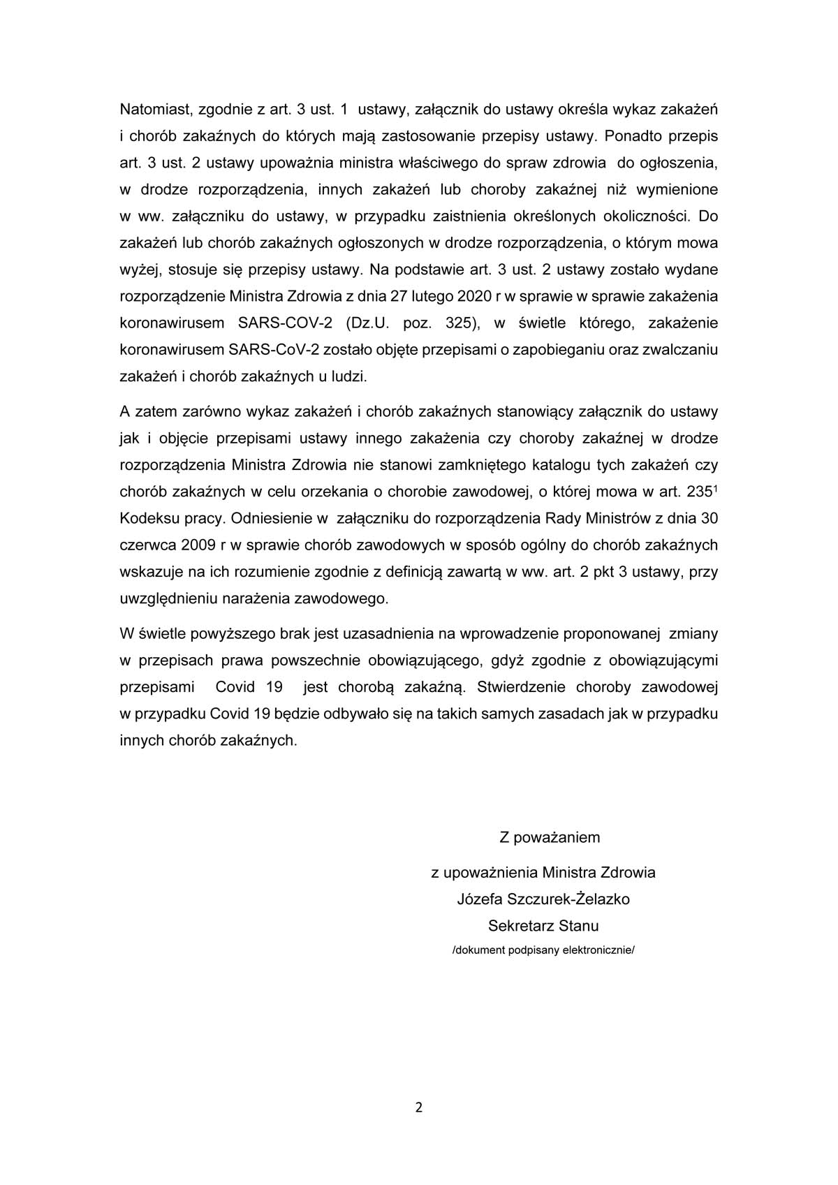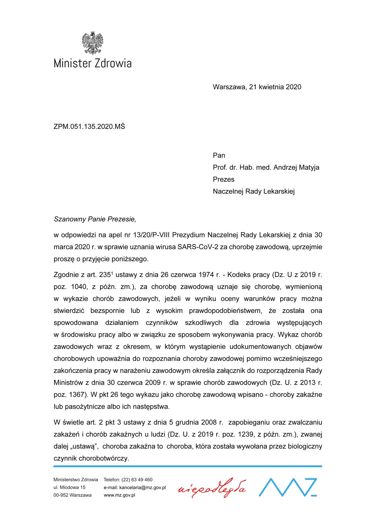 Jest to odpowiedź na apel Prezydium Naczelnej Rady Lekarskiej z 30 marca br., który był skierowany do Prezesa Rady Ministrów w sprawie uznawania choroby zakaźnej wywołanej u lekarza lub lekarza dentysty wirusem SARS-CoV-2 za chorobę zawodową.